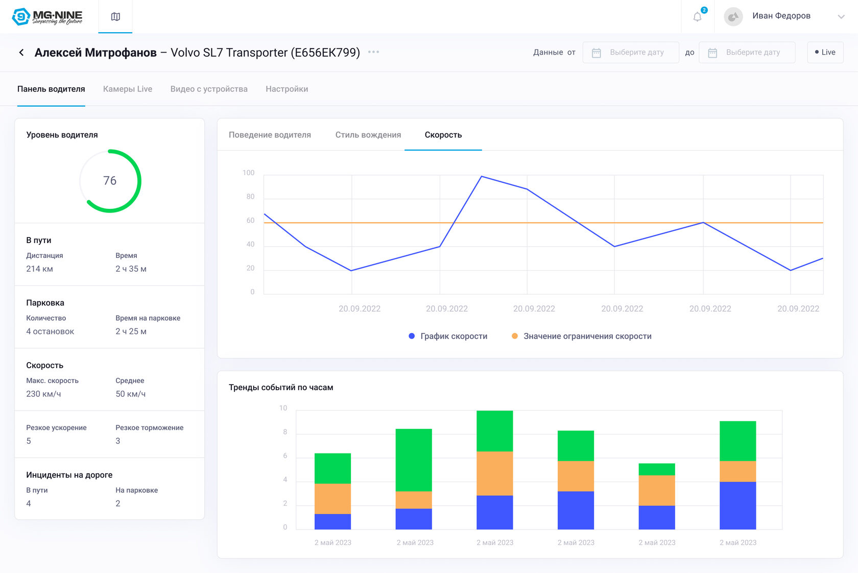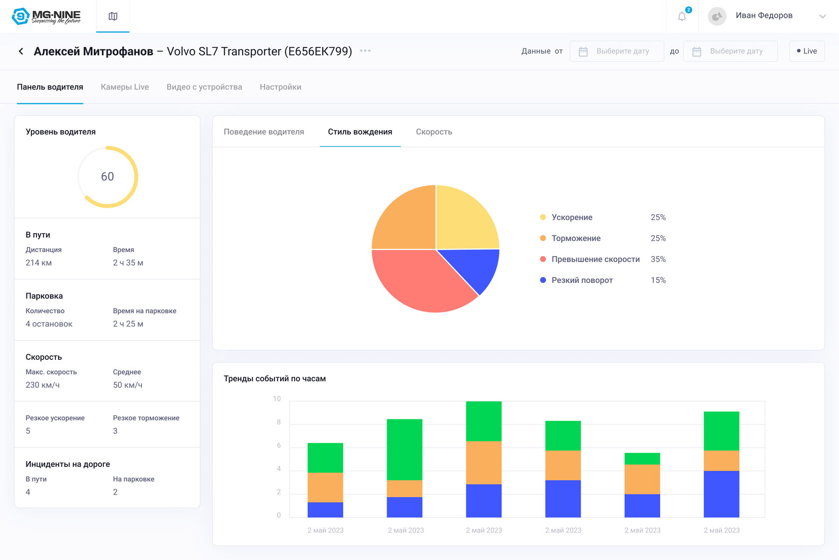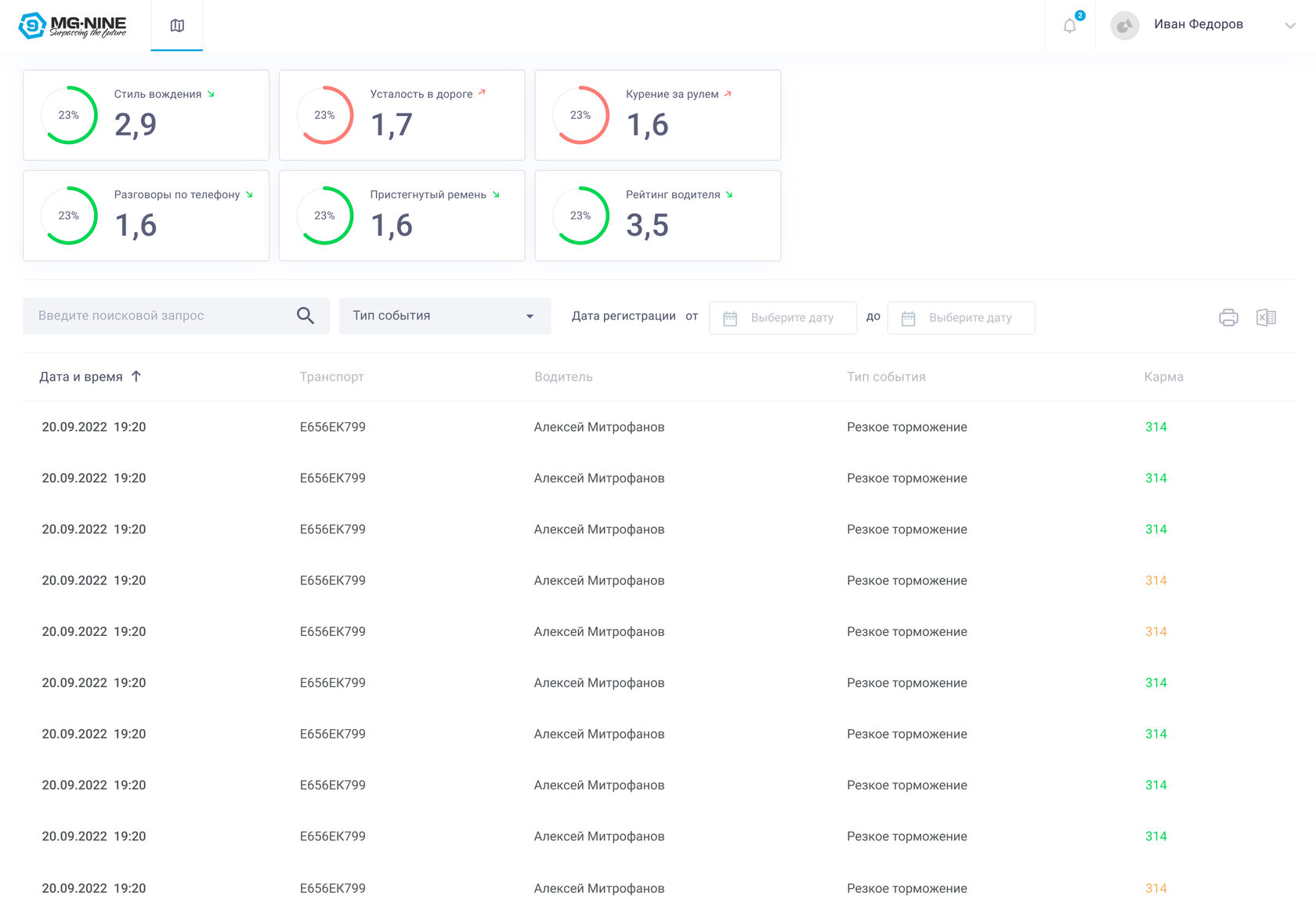 В программе мониторинга можно посмотреть всю информацию и статистику по ТС и водителю